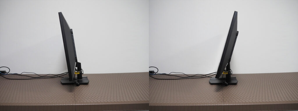 また、本機のスタンドは画面を前後に傾けられる「チルト機能」のみ利用できる。上は20°、下は5°まで傾けられ、見やすい角度に調整するのに便利だ。