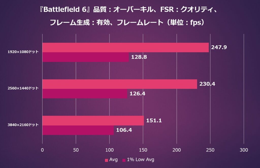 『Battlefield 6』は1つ前の『Battlefield 2042』よりも軽い傾向にあり、別件で検証したミドルローのビデオカードであるGeForce RTX 5060を搭載したPCでも、今回と同じ画質設定でDLSSx4を使用すれば、平均120fpsを超えていた。そのため、フレーム生成が使える最新世代のGPUを搭載したPCであれば、WQHD以上の解像度で快適に遊べるようだ。