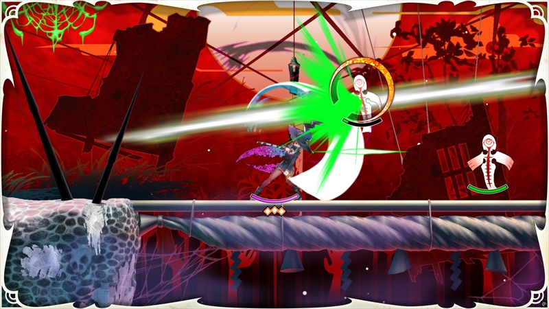 また、チャプターの締めを飾るボス戦も魅力のひとつだ。以下の図を見ればわかるように、本作のボス戦は少々特殊な仕様となっている。決められた数の「魂の火」を断ち切ることで、ボスを討伐できる。たとえば魂の火が3つあった場合、相手の体力ゲージを3回削る必要があるということだ。