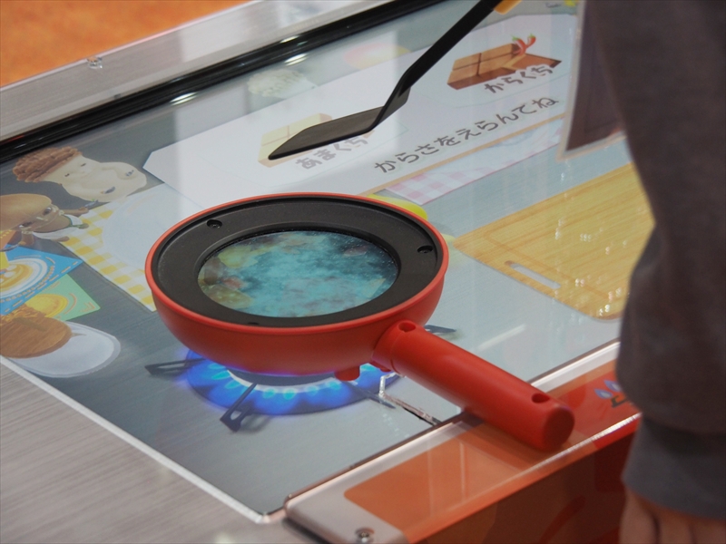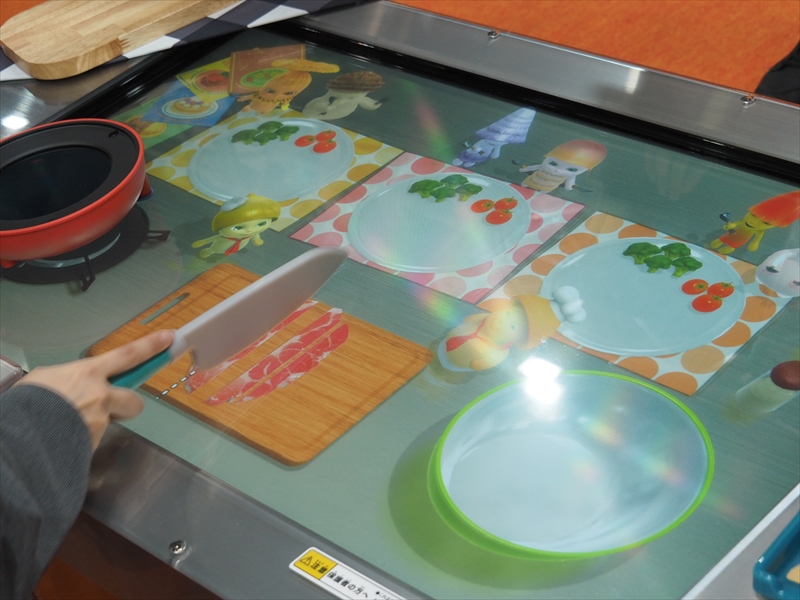 食材などはキッチンに見立てたディスプレイに表示され、ナベにも小さなディスプレイで煮込み料理などの映像を表示。仮想的ながら、かなりリアルな料理体験をお子さんに体験できるユニークなコンテンツとなっていた。