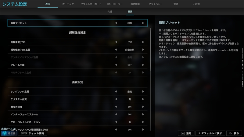 筆者はロボットゲーム好きなので、新シーズンが開始した『Mecha BREAK』のフレームレートもチェックしてみた。プリセットは最高設定の「超高」、FSRは画質優先、フレーム生成を有効にしてフレームレートを測定している。