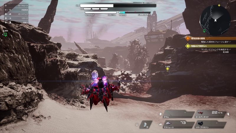 もう1つロボットゲームとしてマーベラスの『DAEMON X MACHINA TITANIC SCION』をプレイしてみた。自分好みにカスタマイズした「アーセナル」と呼ばれるアーマースーツを身に纏い、地上と空中を自在に駆けながら戦うアクションゲームだ。