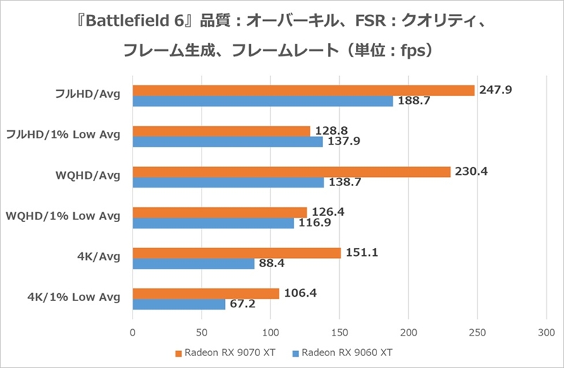 前作がやや動作が重く不評だったため、開発が軽くしていると謳っている『Battlefield 6』は確かに想像していたよりは軽く、Radeon RX 9060 XTでも4K高解像度で平均88.4fpsと高いフレームレートを維持。WQHDなら平均138.7fpsと144Hz以上のディスプレイが活かせる。