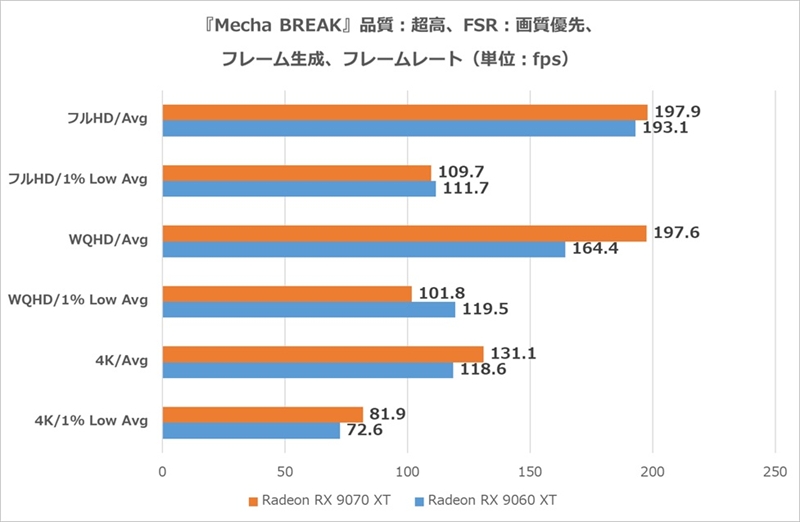 FPSの場合は、120fps以上のより高フレームレートでプレイしたいというユーザーはいると思うが、グラフィックプリセットを変更するだけで十分120fpsに届きそうな性能を有している。Radeon RX 9070 XTであれば、現状4Kでも平均151.1fpsで動作しているため、240Hz以上のディスプレイを活かしたい、といったコアなユーザーならRadeon RX 9070 XTで余裕を持たせるのもアリだろう。