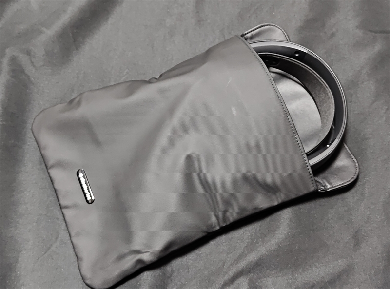ヘッドセットのキャリーケースは布製が多いところ合皮製で、高級感のあるしっかりとした作り。蓋にはマグネットが入っていて、軽く閉じる仕様。中にはチャック付きのポケットがあり、3.5mmオーディオケーブルなどが収められる。