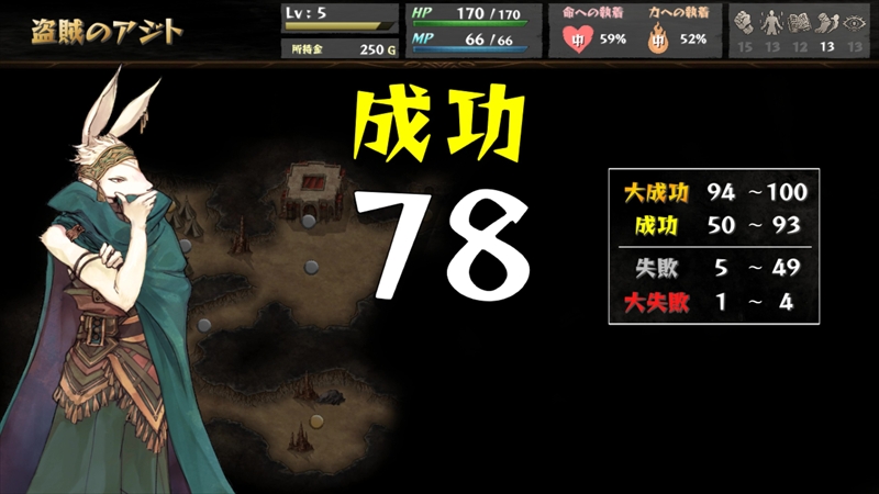 各種イベントはプレイヤーの選択肢で進行するのだが、「成功」と「失敗」の概念がミソとなっている。何かアクションを起こそうとすると、TRPGのように「ダイス判定」が発生し、表示された数字で行動の成否を決める形だ。ダイス判定は古き良きルールのひとつではあるが、昨今のJRPGにはない選択の重みを体感することができた。