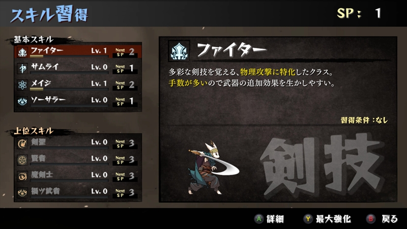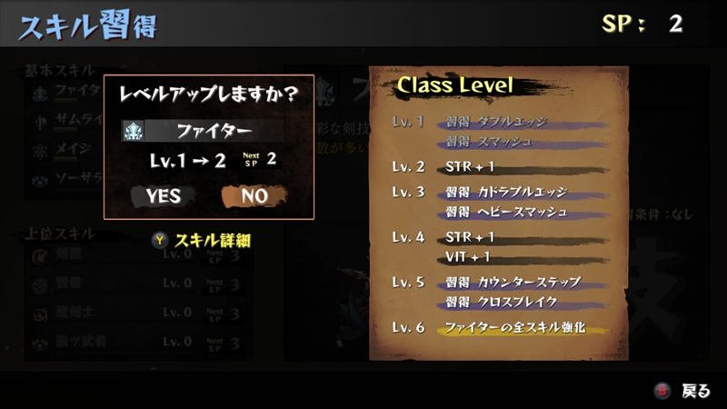 また、レベルアップするとスキル習得に必要な「SP」(ポイント)がもらえ、各クラスに割り振れるようになる。