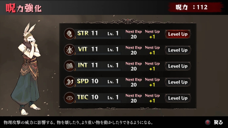 戦闘や選択肢の結果では、レベルアップに必要な経験値に加え、ステータスの強化に必要なポイント「呪力」ももらえる。その呪力を筋力や体力、知力などのステータスに割り振ることで、主人公の強化が可能だ。