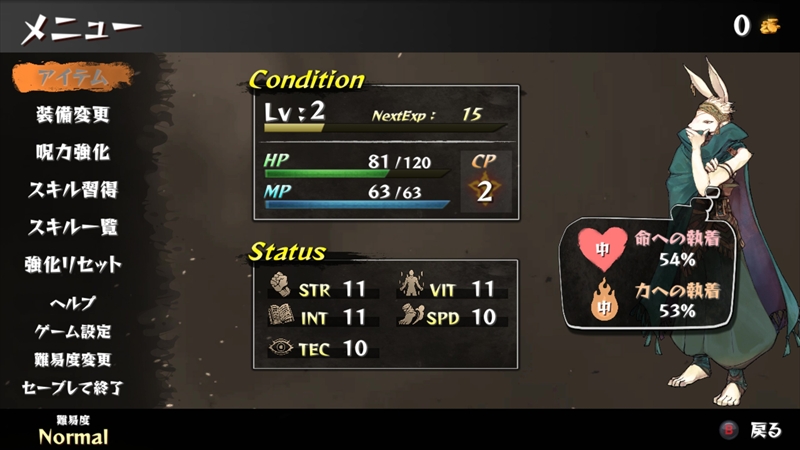 最後に『いのちのつかいかた』のキャラクターカスタマイズを述べたい。従来のRPGと同じように、本作は戦闘やイベントで経験値をかせぎ、レベルを上げていくスタイルを採用している。