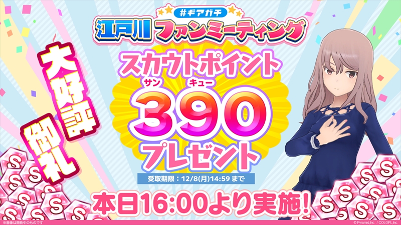 加えて、ファンミーティングを記念して、イベント開催日の11月24日16時からスカウトポイント390ポイントがプレゼントされた。⒓月8日(月)14:59までとなっているので、忘れずに受け取ろう。