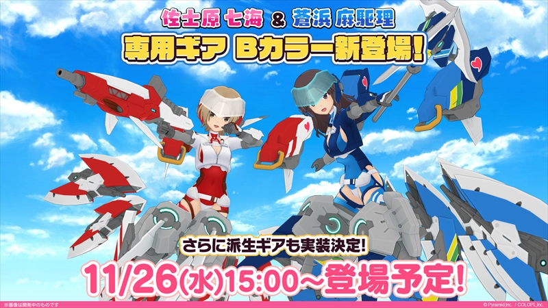 また、佐士原 七海と蒼浜 麻駆理の専用ギアBカラーも11月26日(水)15時から実装予定。派生ギアも実装するとのこと。