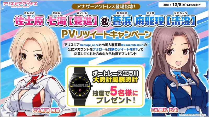 佐士原 七海と蒼浜 麻駆理のアナザーアクトレス登場記念のPVツイートキャンペーンも⒓月8日(月)14:59まで開催。アリスギアの公式X(@colopl_alice)と、七海&麻駆理の公式X(@NanamiMakuri)をフォローし、対象のツイートをRTして応募した人の中から抽選でボートレース江戸川 大時計風腕時計が抽選で5名様にプレゼントされる。