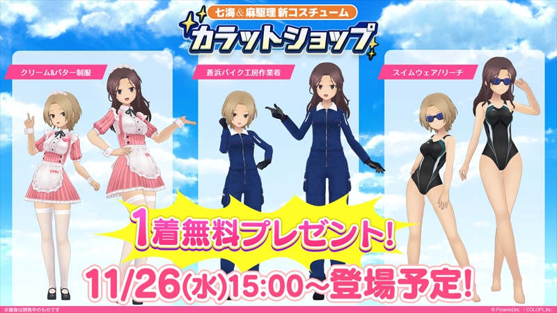 さらに、11月26日(水)15時からカラットショップにて佐士原 七海と蒼浜 麻駆理の新コスチュームが追加される。そのうえ、ファンミーティングを記念して1着無料でプレゼントされる。