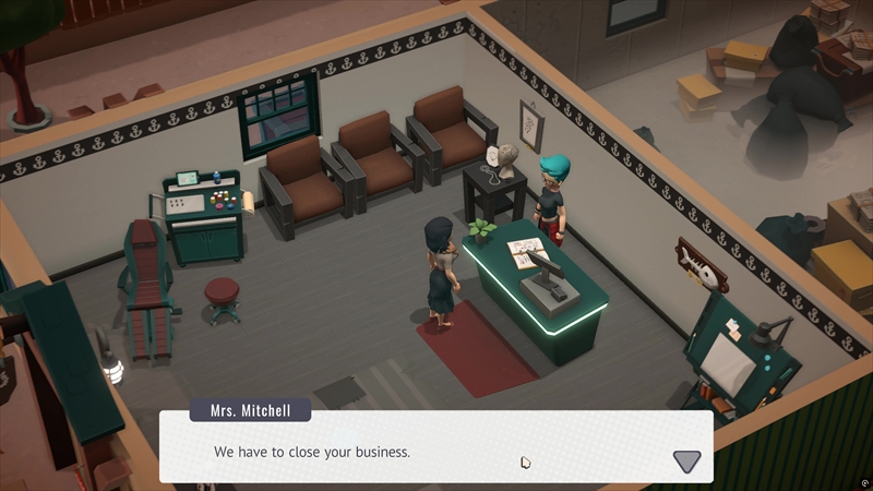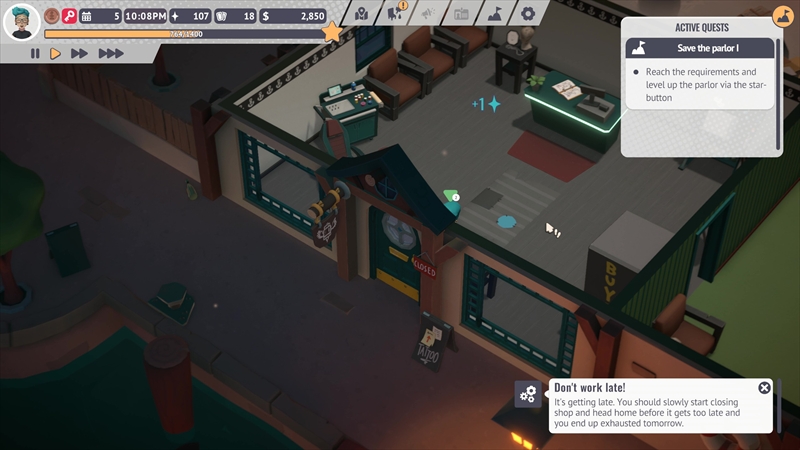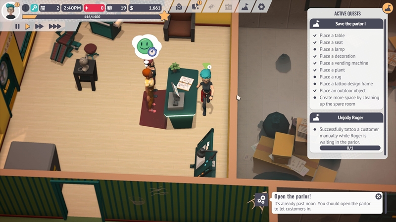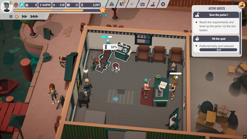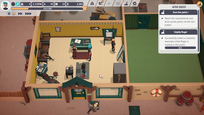 ゲームは終始見下ろし視点で進行する。接客やタトゥー彫り、機材メンテナンス、雑務などをこなす