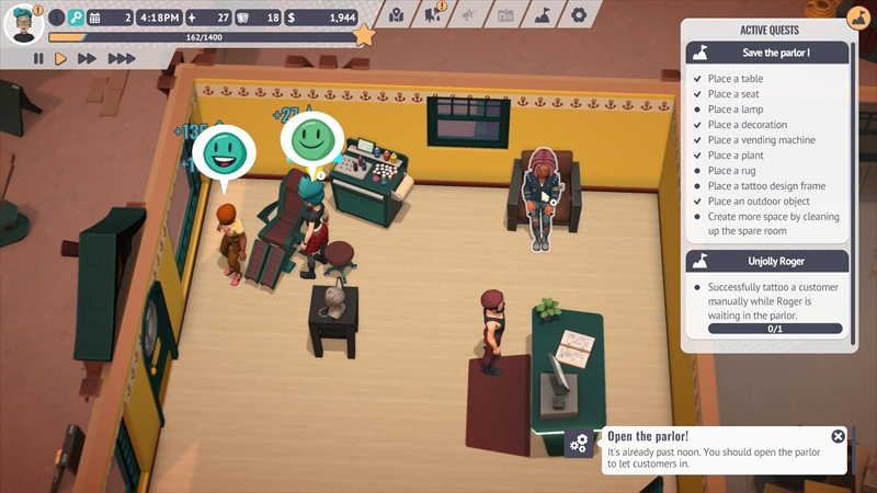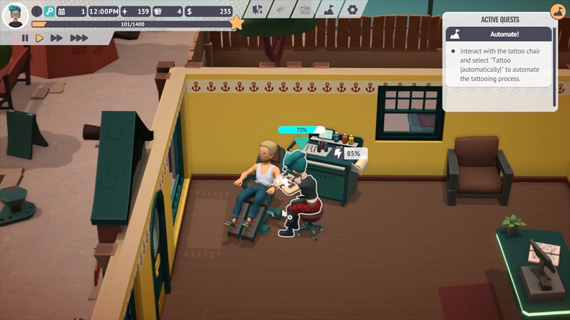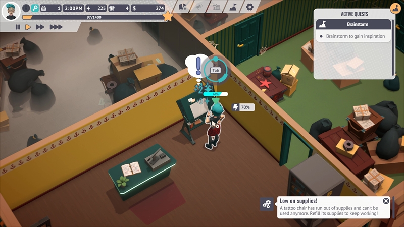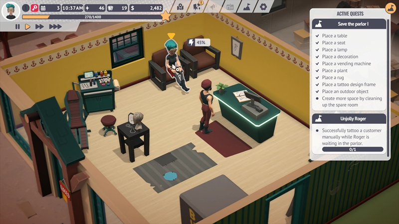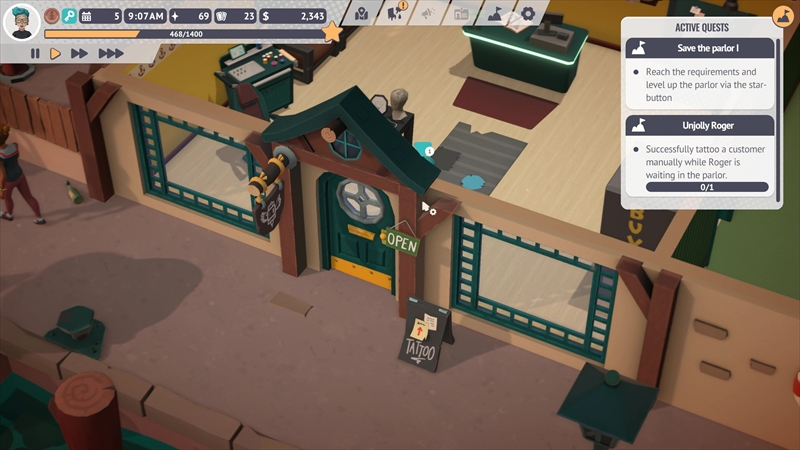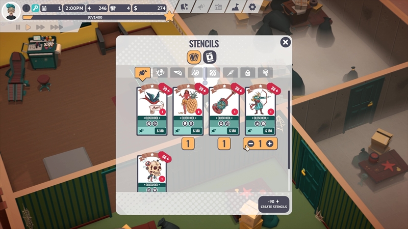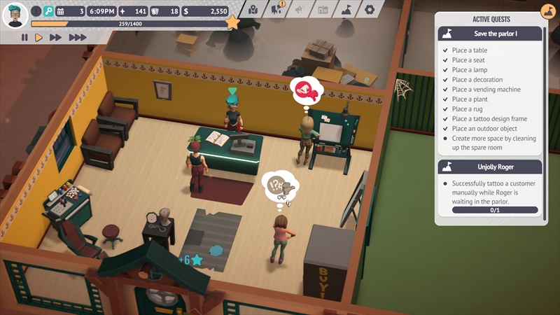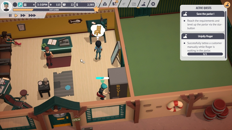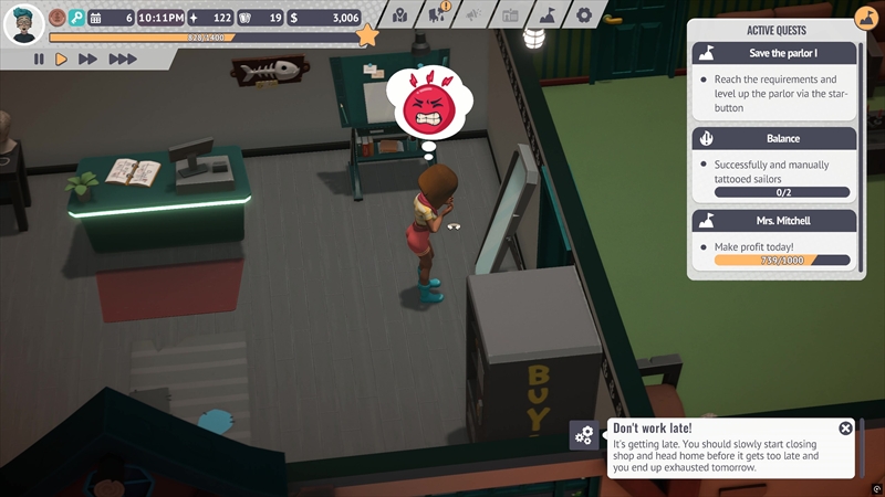 タトゥーを彫るだけでなく、お店の内装をデコレーションしたり機材のメンテナンスをしたりするなど、タトゥーショップの仕事は多岐にわたる。日本語未実装も相まって難しそうに見えるが、中学・高校生レベルの英語力と店舗経営系シミュレーションゲームのプレイ経験があればなんとか遊べる……と思われる。