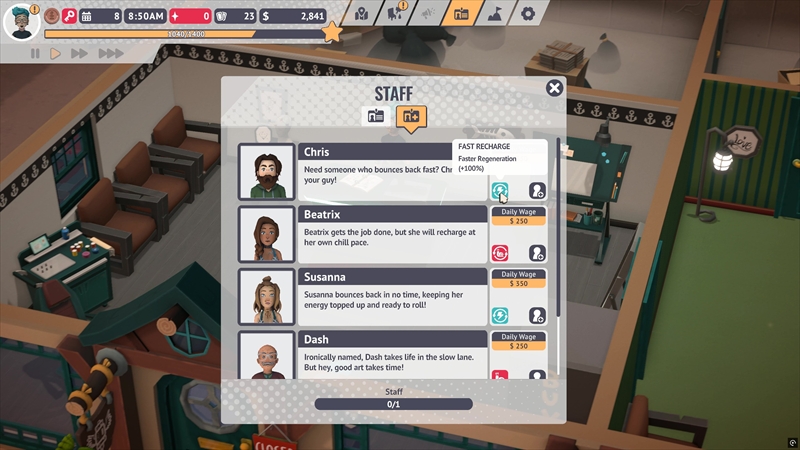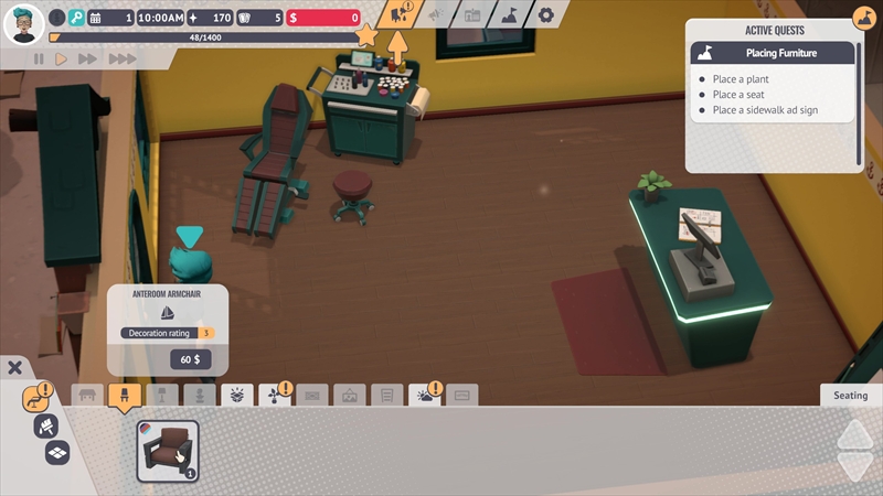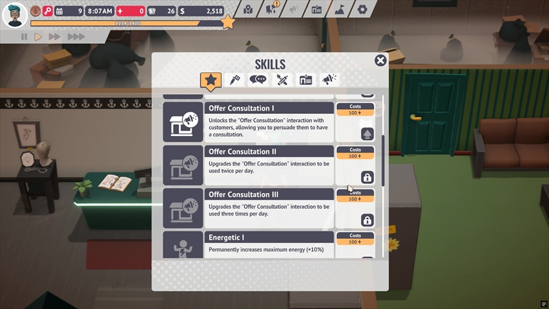 とくにエネルギーをすべて消費すると仕事が一切できなくなるため、椅子に座って休憩する必要がある。お店を営業するうえで、金銭やリソースだけでなくステータスの管理も必要不可欠だ。