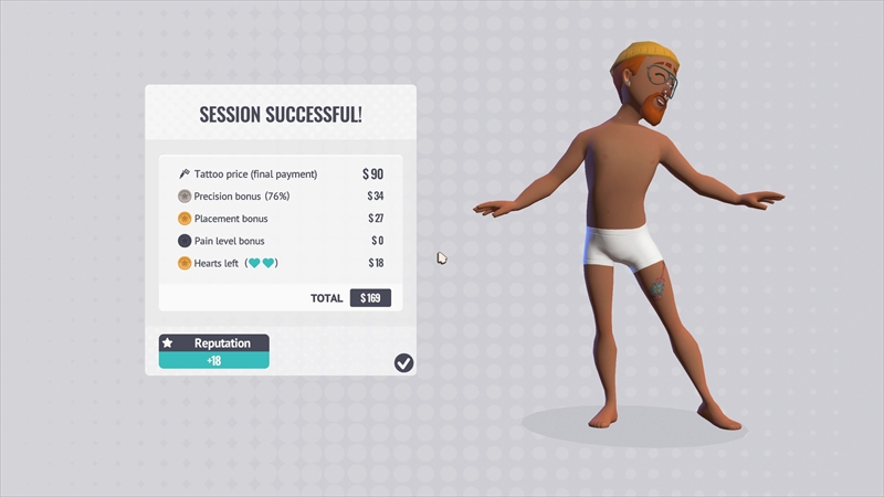 こちらは成功画面。タトゥーのクオリティやボーナス報酬を加えたものが売り上げとなる