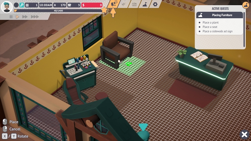まず、椅子やテーブルなどの「家具」に加え、絵画や植物、照明、カーペット、壁紙などの「インテリア品」、そしてちょっとした利益になる「自動販売機」などを店内に設置できる。各アイテムはインスピレーションでアンロックし、資金で購入すれば設置可能だ。