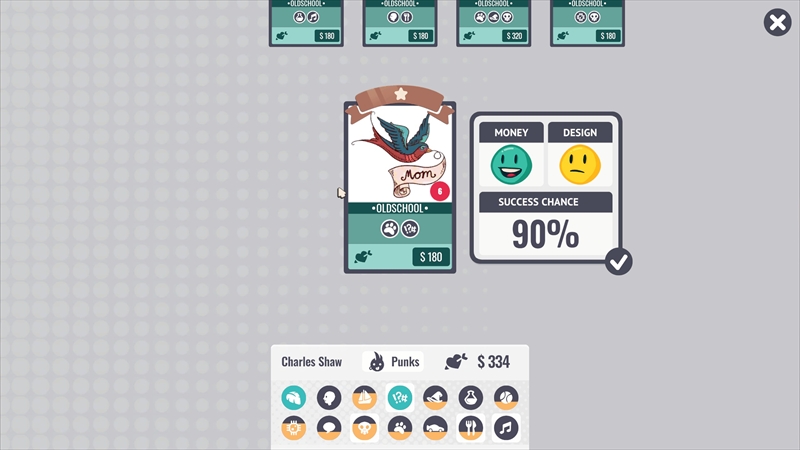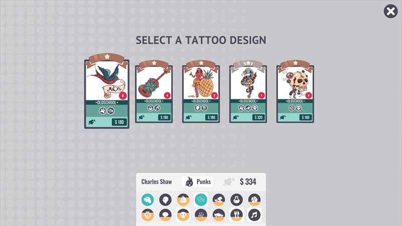 デザインの方向性が決まったら、客の好みに合うタトゥーのデザインを選択する。好きなデザインのアイコンが付与されたものを提案し、客に気に入ったらいよいよタトゥーを彫る作業へ。ただし、好みではないサンプルを提案すると客は怒って帰ってしまう。