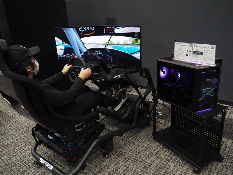 レーシングシムもプレイできた。PCは前面にタッチ操作対応の13.3インチの大型ディスプレイを搭載した高性能PC「MEG Vision X AI 2NVZ9-014JP」。ディスプレイは49インチのQD-OLEDパネルの「MPG 491CQPX QD-OLED」
