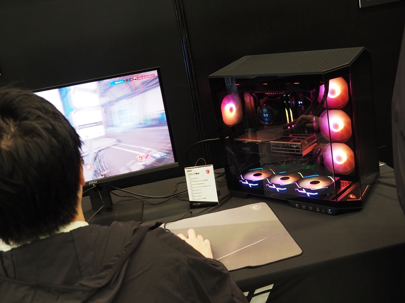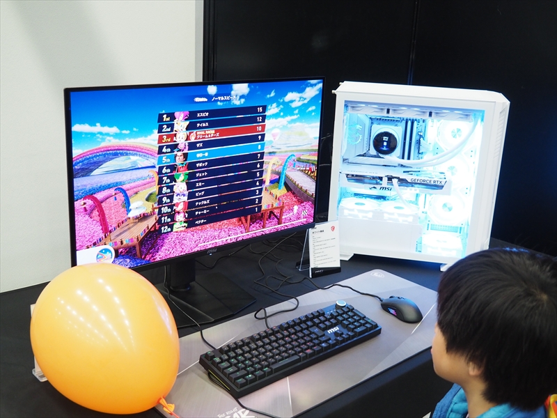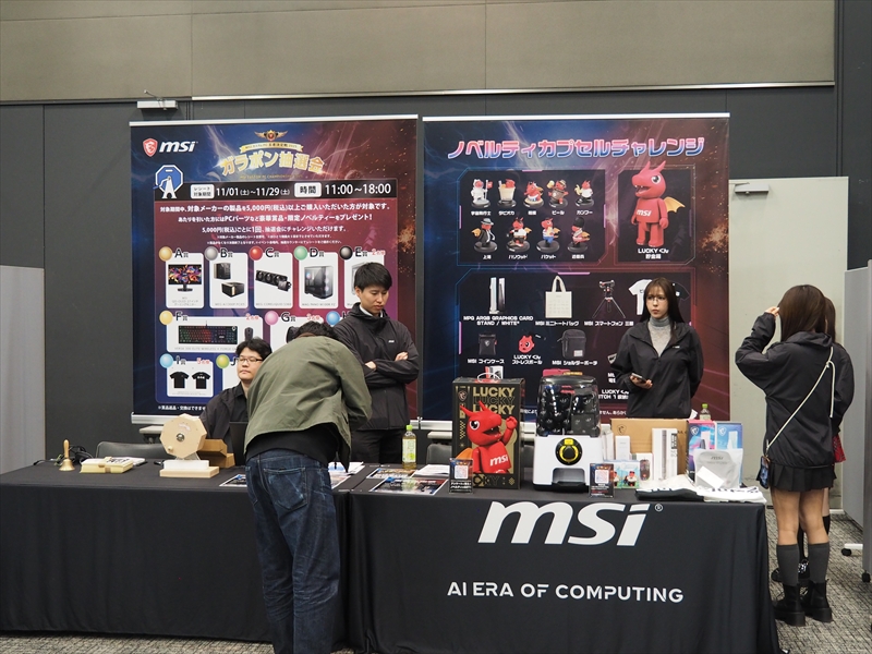 会場観覧席の後ろの中央には、MSIのマザーボードやビデオカードがズラリ。また、ゲームが試遊できるコーナーや、対象メーカー製品を5000円(税込)以上購入した人を対象とした豪華賞品・限定ノベルティーが貰えるガラポン抽選会も行なわれていた。