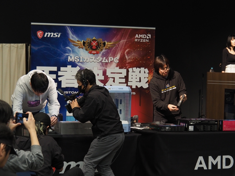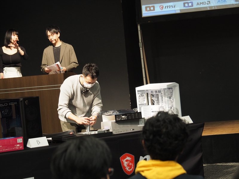 全員同じ工具を使って早組に挑戦。PC構成は全員バラバラで、くじ・抽選で選んだ構成で組むため、本大会は運も左右される。また、初めて触るパーツに苦戦する人も。