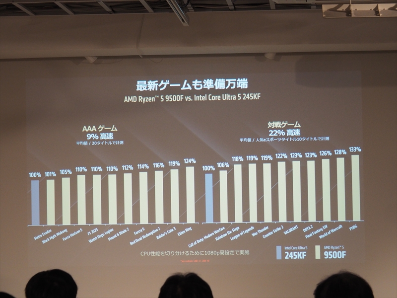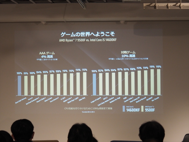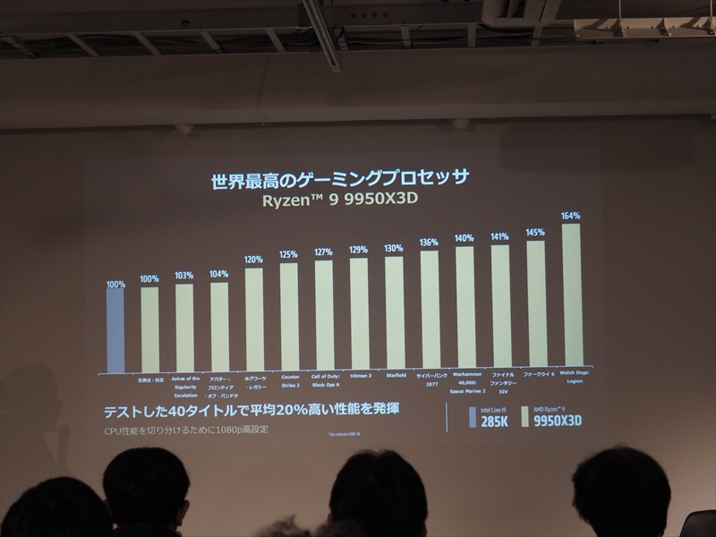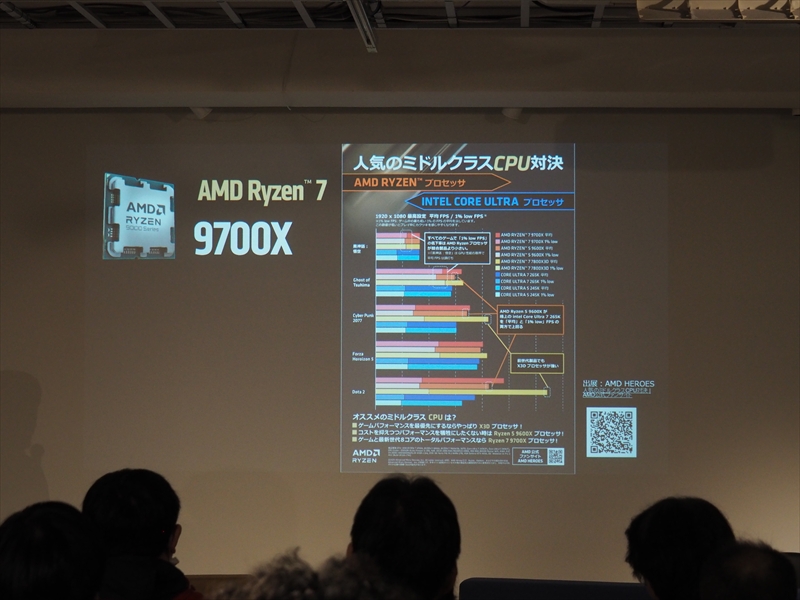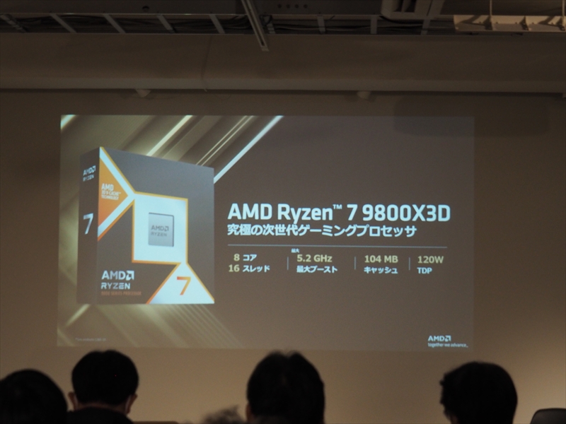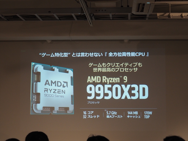 また、3D V-Cacheを搭載し、ゲームにおいて最強となったRyzen X3Dシリーズは、コア/スレッド数の多いRyzen 9 9950X3Dがクリエイティブ性能も高く、全方位CPUとなったとアピール。ゲーム性能のみを求めるユーザーには、Ryzen 7 9800X3Dが好評だが、高いゲーム性能の引き上げよりは、コスパのバランスが良い高性能PCを作る人に人気のRyzen 7 9700Xも売れていると語った。