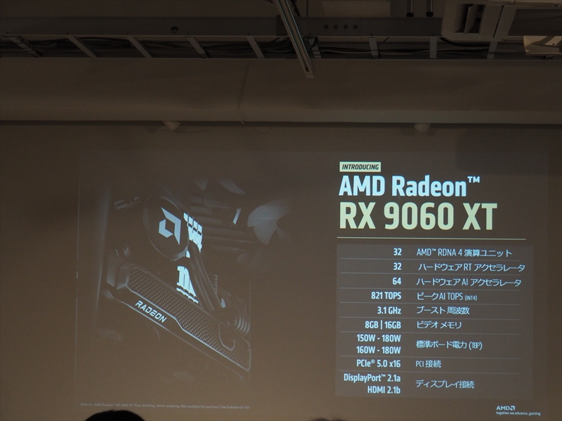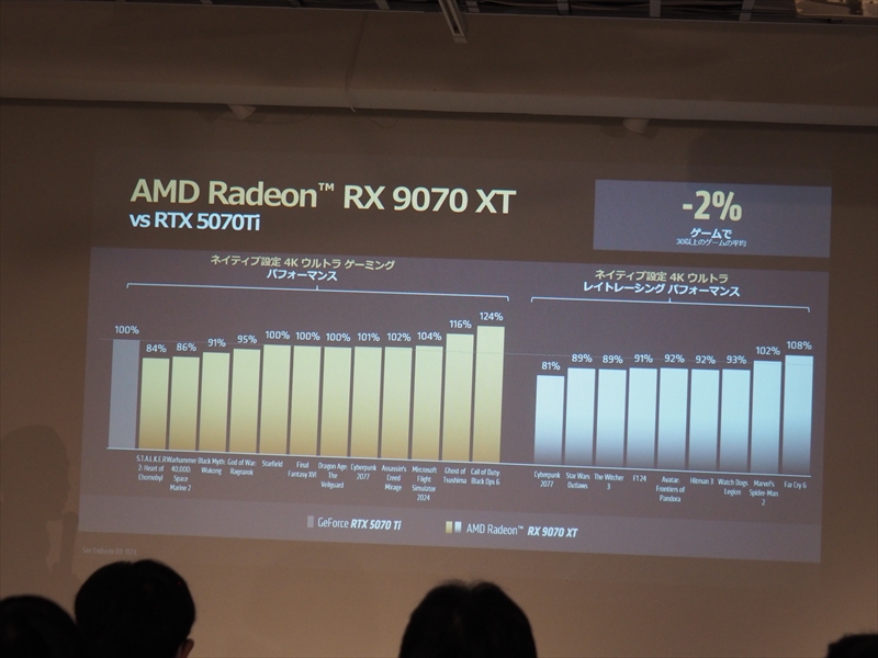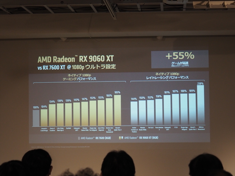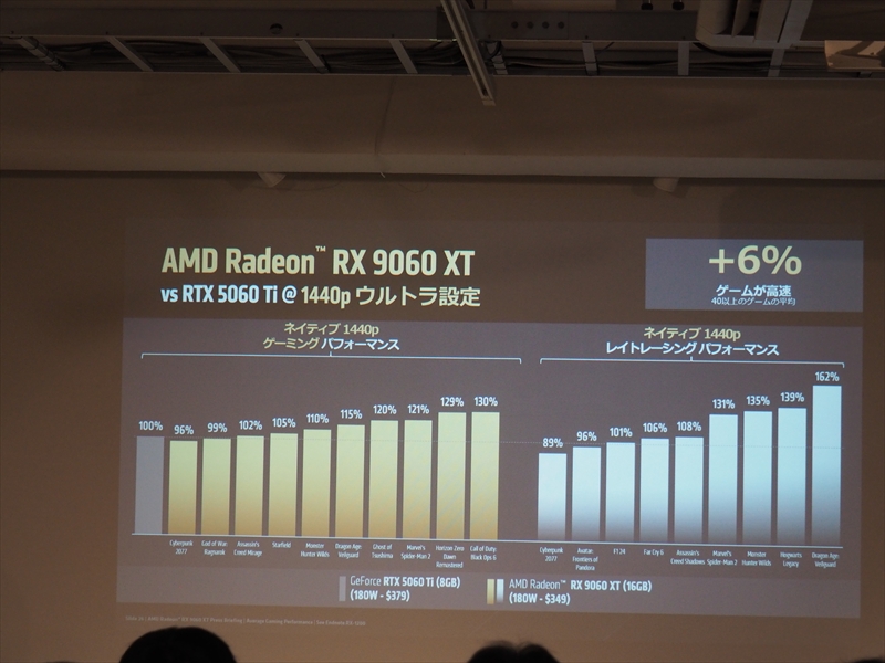 また、2025年はRadeonにおいても飛躍の年で、Radeon RX 9070シリーズは、レイアクセラレータ―やAIアクセラレーターの世代が上がり、性能も向上したことで、今まで弱点とされてきたレイトレーシング性能において、GeForceに迫る性能を見せ、コスパにおいて勝ったために非常に人気を博したとアピールした。