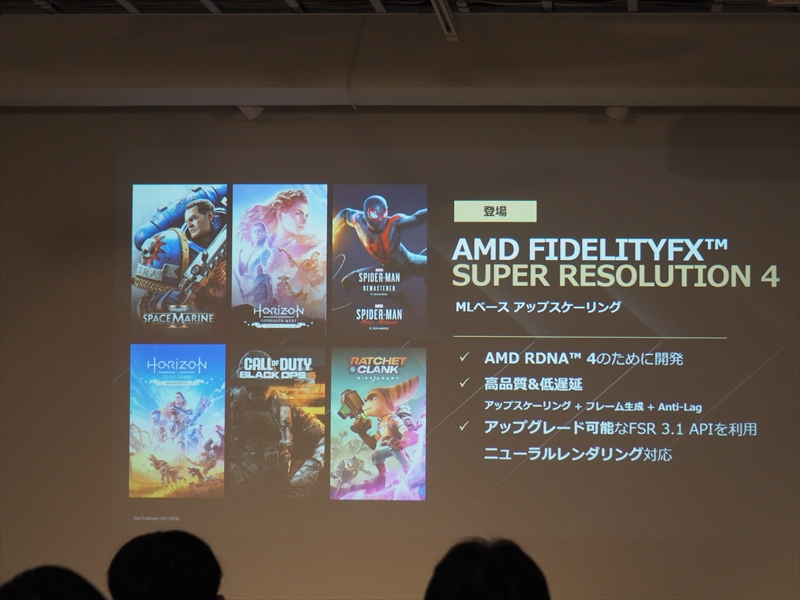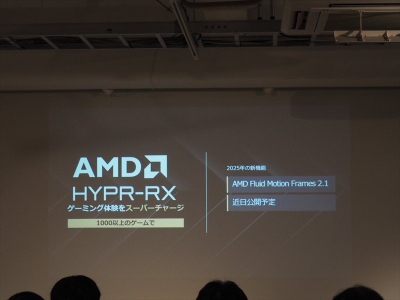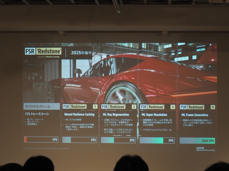 また、設定しただけでゲームなどに最適化されるHYPR-RXや、フレーム生成技術でゲーム問わずフレームレートが向上すると話題になった「AMD Fluid Motion Frame」(AFMF)が、バージョン2.1になり安定性が増し、近日ML(機械学習)により、間接光の推測や、ノイズの低減、リアルタイムアップスケーリング、フレームレートの向上が行なわれるようになる新機能の総称「FSR Redstone」も紹介された。