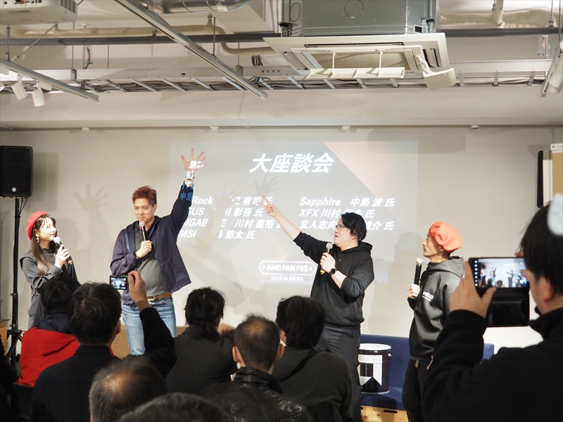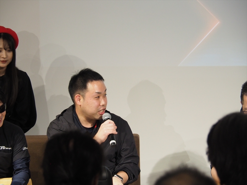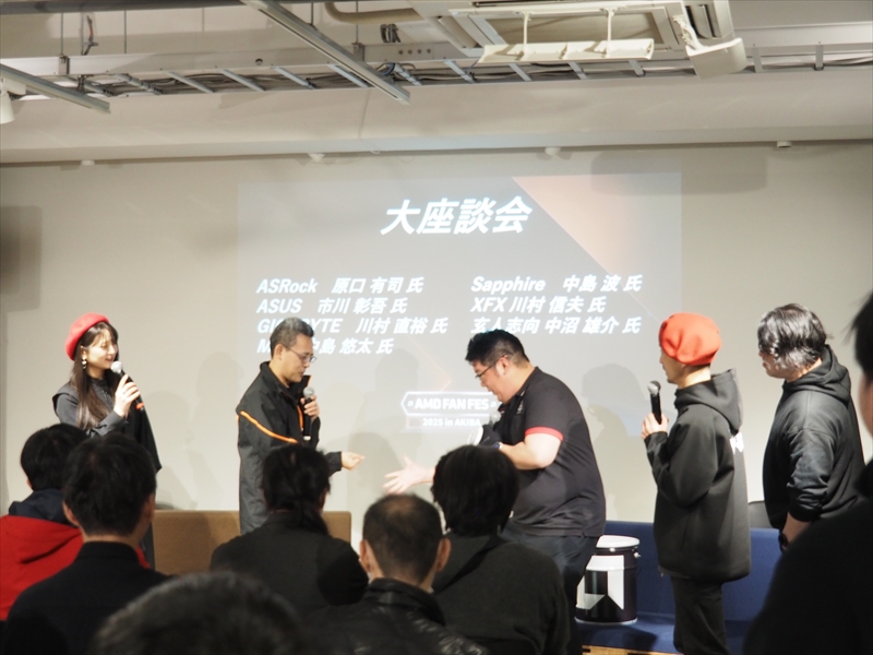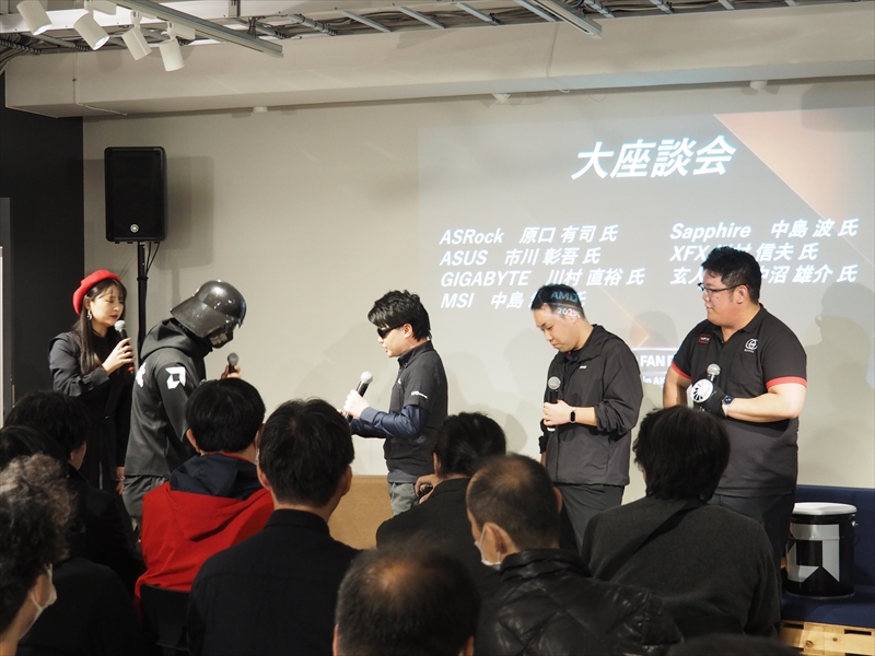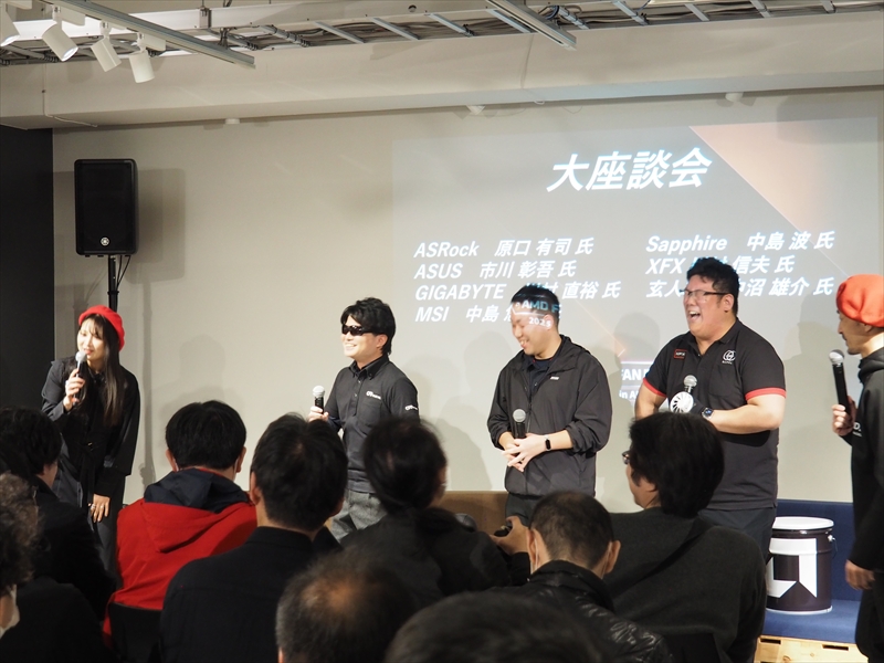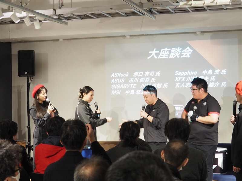 後半は各主要PCパーツメーカーと、呼ばれていないのにやってきたといじられていた人気YouTuberのgradeon卿による、座談会が行なわれた。今回はいつもより人数が多いということで、じゃんけんで勝った方が前半、負けた方は後半登場するという形で2回に分けられた。また、川村&中島性がお2方ずついるということで、じゃんけんで前半後半で分かれるような形で行なわれた。