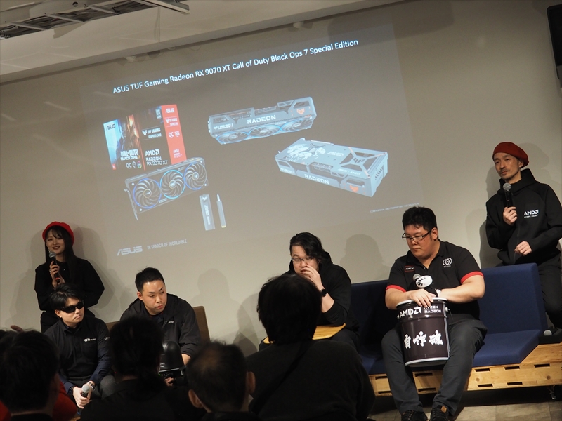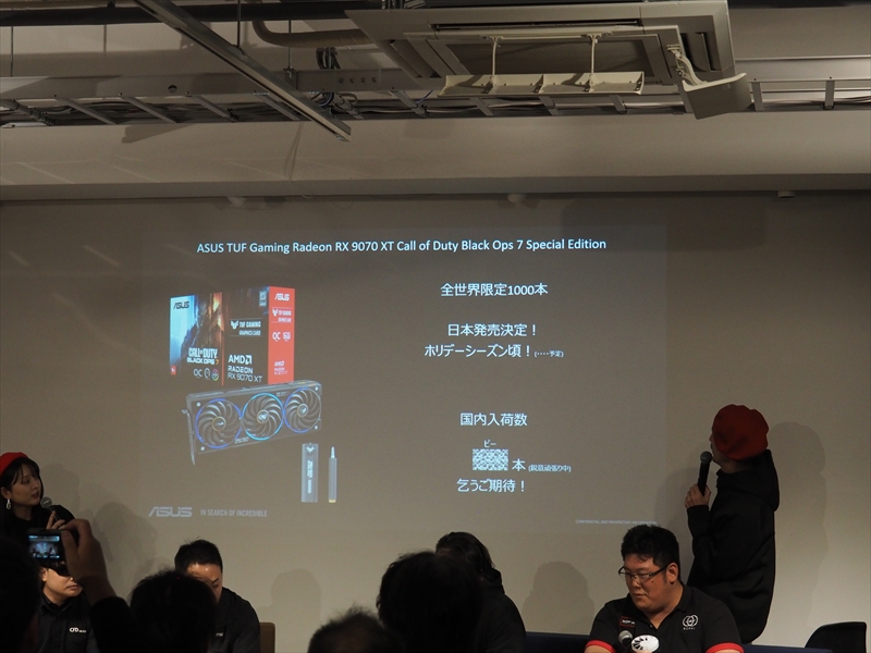 まず前半パートでは、各登壇者が自社製品を与えられた短い時間でアピール。ASUS市川氏は、11月14日に発売されたばかりの人気FPSシリーズ最新作『Call of Duty: Black Ops 7』とのコラボモデルのビデオカードを紹介。本製品は『Call of Duty: Black Ops 7 Standard版』のコードもバンドルされているという。