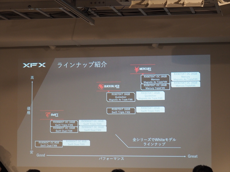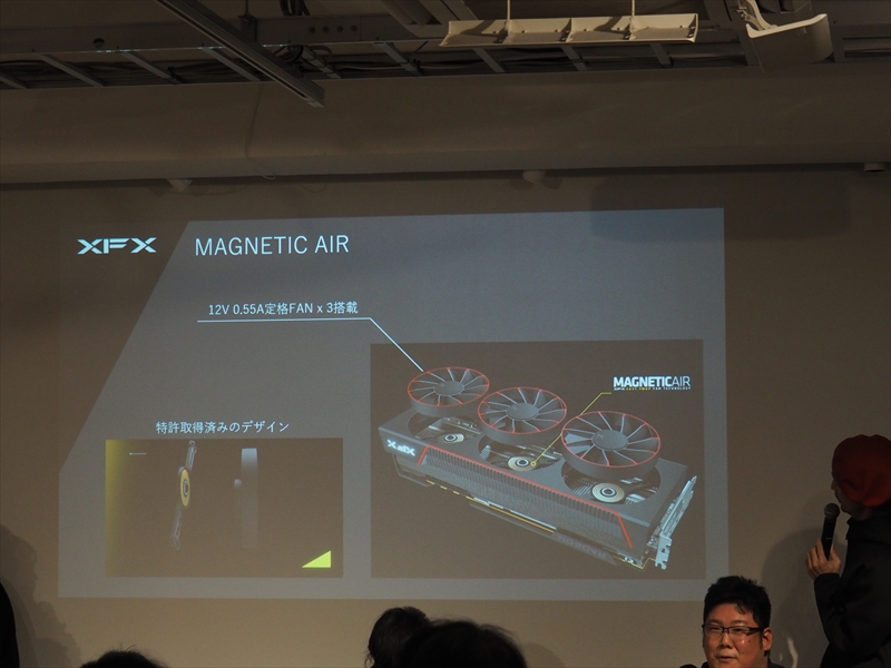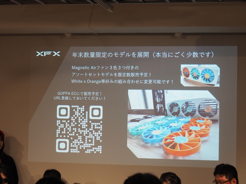 XFXの川村氏は、XFXのラインアップに加え、年末に数量限定で販売する予定の、3色のMagnetic Airファンが3つずつ付属するビデオカードを紹介した。