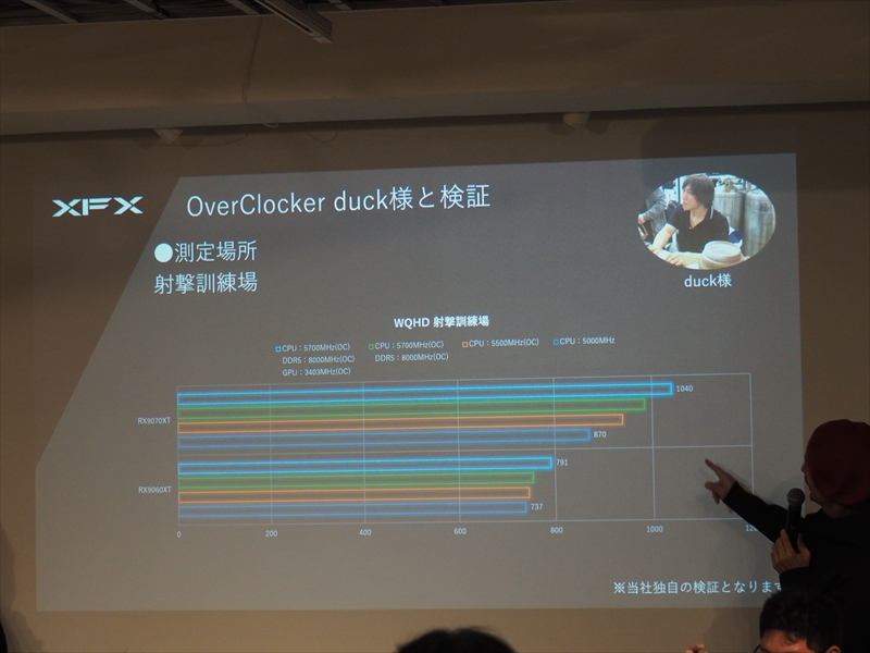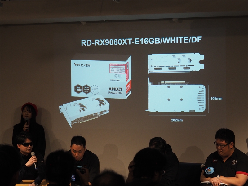 玄人志向の中沼氏は、ブラケットも白いホワイトカラーかつ幅が202mmとコンパクトなRadeon RX 9060 XT搭載ビデオカードを紹介。玄人志向と言えば化粧箱がシンプルな茶箱が多いところ、真っ白でデザイン性のある化粧箱になっていることにも言及した。