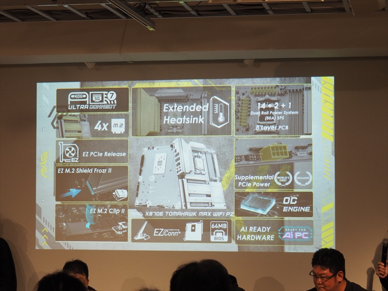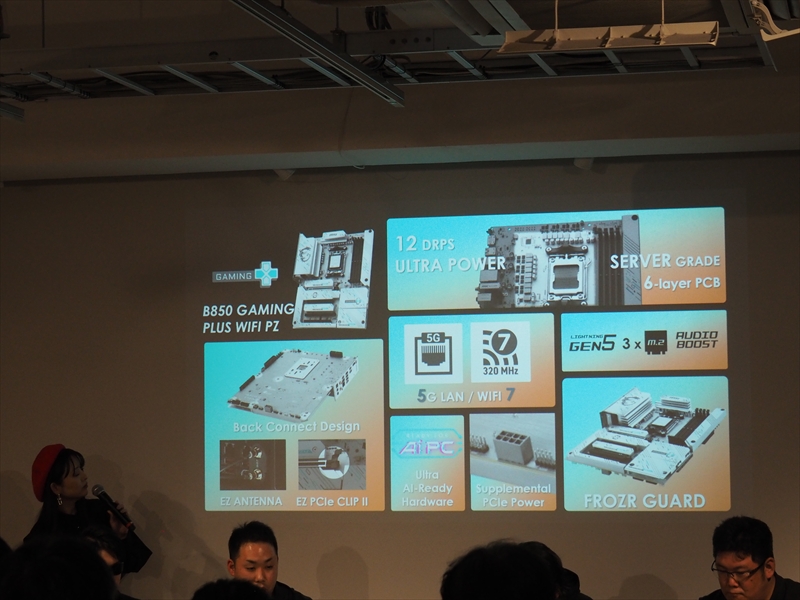MSIの中島氏は、11月末に発売されたスタンダードクラスの背面コネクターマザーボードである「MAG X870E TOMAHAWK MAX WIFI PZ」と、それよりも価格が抑えられた同じく背面コネクター対応の「B850 GAMING PLUS WIFI PZ」を紹介。背面にコネクターがあるため、配線が表に出ず見た目スッキリと組めるほか、組み易さを重視した「EZ DIY」機能により、自作初心者にもオススメできるとアピール。