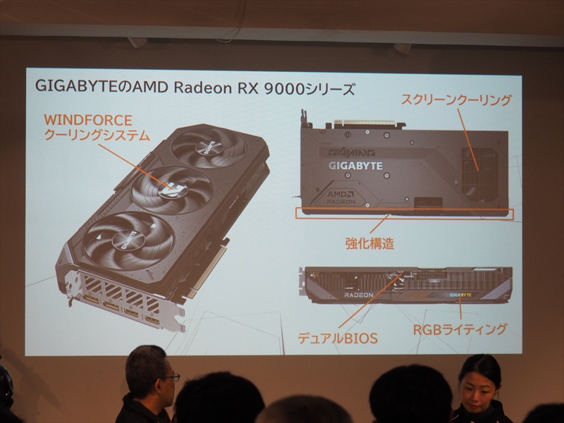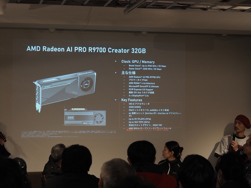 「AMD Radeon AI PRO R9700 Creator 32GB」は、ファンの近くが2mmくらい凹んでいるため、複数枚挿しても吸気できるようになっている。そのため、3枚以上挿すと3枚目以降が競合よりも2~3°冷えるが、これはたまたまの産物で狙ったものではなかったと語り、会場の笑いを誘った。