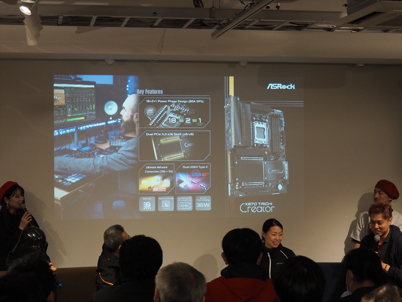 後半の座談会では、最初にASRock 原口氏がTaichiシリーズ初のクリエイター向けモデルで、初回出荷から3日で売り切れるほどに人気な「X870 Taichi Creator」と、「AMD Radeon AI PRO R9700 Creator 32GB」を紹介。