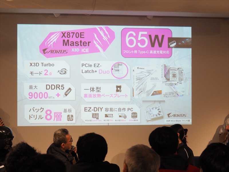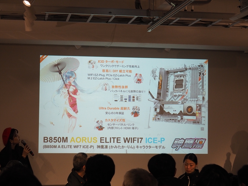 GIGABYTEの川村氏は、自動でオーバークロックする「X3D Turboモード」機能を備えるのが特徴の「X870E AORUS MASTER X3D ICE」を紹介。PCI Expressは、2つともボタンを押すとロックが外れる機能を搭載するなど、簡単に組み換えできるところもイチオシだと語った。また、前述した神鷹凛をモチーフにした「B850M AORUS ELITE WIFI7 ICE-P」も紹介した。