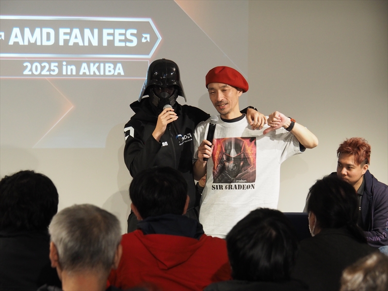 gradeon卿は、自身のグッズであるTシャツをアピール。佐藤氏が着てきて、写真撮影も行なった。また、gradeon卿が手掛けるブログ「あかぐらぼ」にてAMD Softwareの使い方の記事がまとめられており、それが非情に好評だと佐藤氏が紹介した。