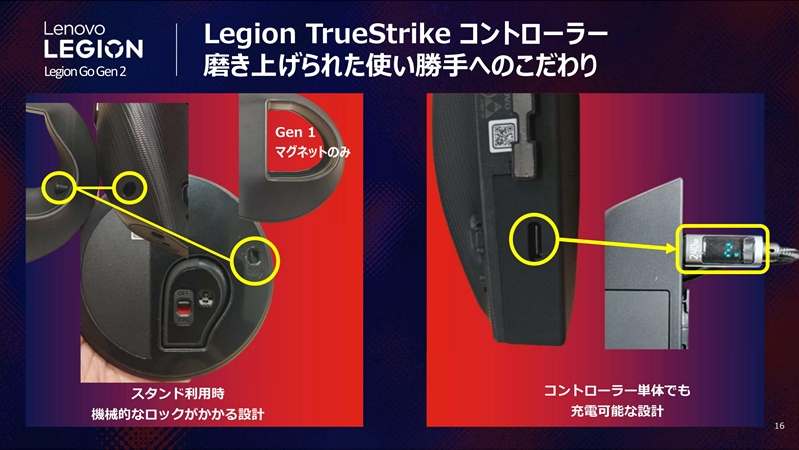 また、同社は従来のLegion Goを発売した後に、Nintendo Switchのように取り外したコントローラーを取り付け、単体のワイヤレスコントローラーとする「Lenovo Legion Go コントローラー用バッテリー付き充電コネクタ」。ドッキングステーションなどをアクセサリーとして販売したが、「Legion Go Gen 2」とも互換性がある。