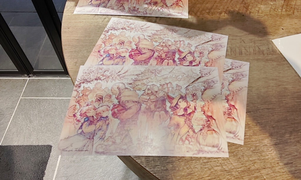 そのほか、店内には『ファイナルファンタジーXIV』の書籍や音楽CD、アパレル、ぬいぐるみなど数多くの商品を販売されていた。ちなみに、本店舗にて3000円(税込)以上物販を購入した人には、1日1枚までポストカードが貰える。