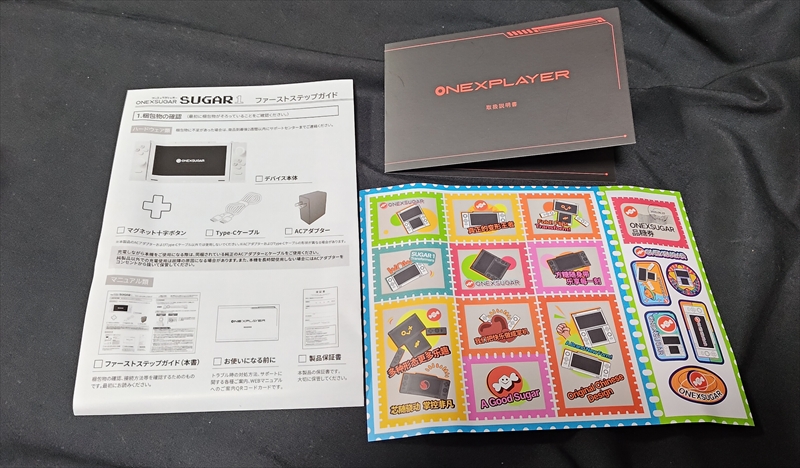 まずはONEXSUGAR SUGAR1の付属品などを確認しておきたい。ONEXSUGAR SUGAR1は、「Indiegogo」でのクラウドファンディングを通じて開発・販売されたAndroidゲーム機だ。、「Indiegogo」では、コントローラー部分のサイドに取り付けられるグリップや、本体の背面と側面を保護するシリコンケース、持ち運ぶのに適したプロテクティブケースや、ジョイスティックキャップ、D-Padカバーなども別途購入できたが、天空による日本正規販売版は、そうした付属品は用意されていない。
