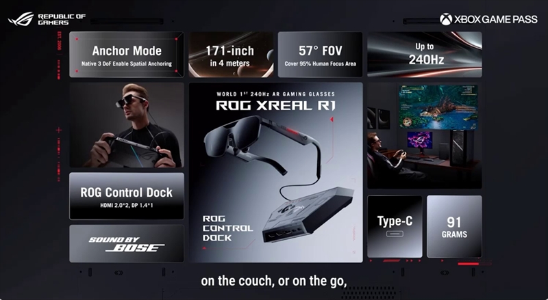 「ROG XREAL R1」は、フルHDのマイクロOLED(1920×1080ドット)、240Hzの高リフレッシュレートに対応したゲーミンググラス。ROG Control Dockを介したHDMIおよびDisplayPort接続により、PCや家庭用ゲーム機とも接続できる。
