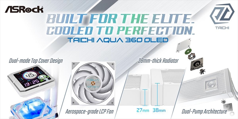 極めて高い熱負荷に対応するよう設計されたTaichi AQUA 360 LCDは、TDP 500Wを超える環境にも耐えうるデュアルポンプ構造を採用し、厚さ38mmの大容量ラジエーターと精密なフローインジケーターを組み合わせることで、運用時の信頼性をさらに高めている。