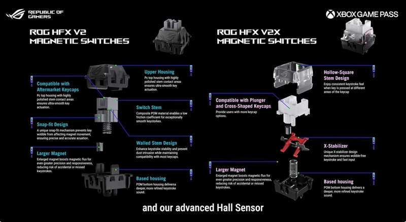 アップグレードされたROG HFX V2マグネティックスイッチと新開発のROGホールセンサーを搭載。さらに、本体で簡単に調整できる感度調整ホイールを新たに導入し、多機能ボタンやインタラクティブタッチパネル、人気のRapid Triggerトグルも引き続き備える。