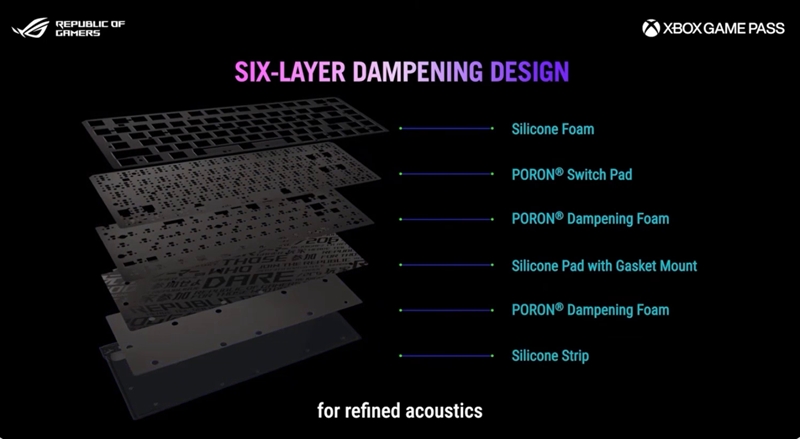 また、洗練された音響と優れたタイピングをもたらす6層の減衰材が詰め込まれている。