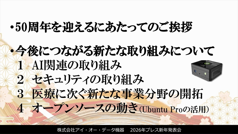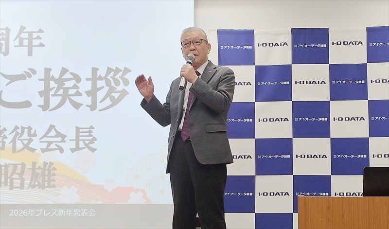 アイ・オー・データ機器は、2026年1月8日に同社の創業50周年を記念するプレス新年発表会を東京都内にて開催した。イベントの冒頭には、アイ・オー・データ機器 代表取締役会長 細野 昭推氏が登壇。同社が今後進める4つの新たな取り組みについて語った。