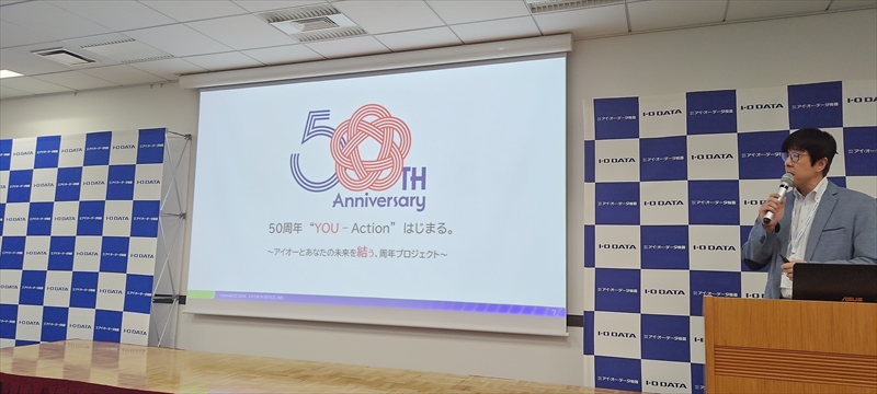 次に、アイ・オー・データ機器 販売推進部部長 西田谷 直弘氏が登壇し、創業50周年の周年事業のコンセプトとして50周年“You-Action”と銘打って推進していくと発表した。このコンセプトは「お客様や社会、そしてあなたと共に動き出す一年にしたい、よりお客様に寄り添った嗜好を持って進めていきたい」という思いを込めているという。