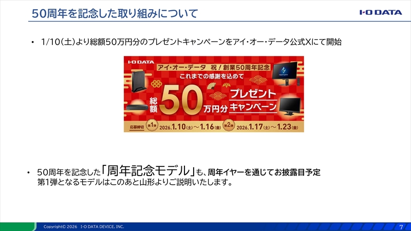 また、50周年のロゴについては、創業の地の石川県の伝統工芸である加賀水引をモチーフにしているとのこと。そのうえで、同社は1月10日(土)より総額50万円分のプレゼントキャンペーンを同社の公式Xにて開催。同社を象徴する商品を2期に渡ってプレゼントしていくとしている。