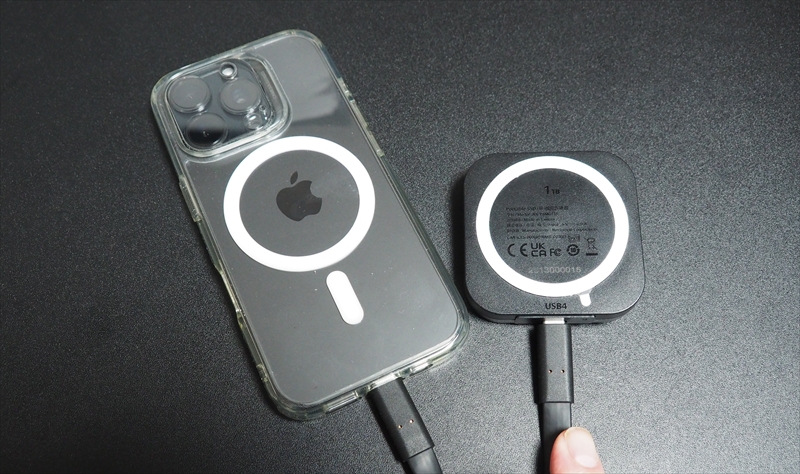 USB Type-Cケーブルが付属し、直接USB Type-C対応のスマートフォンとの接続が可能。iPhone 12以降に搭載された背面に内蔵された磁石でケースや外付けSSDなどがピタッと吸着する「MagSafe」にも対応。