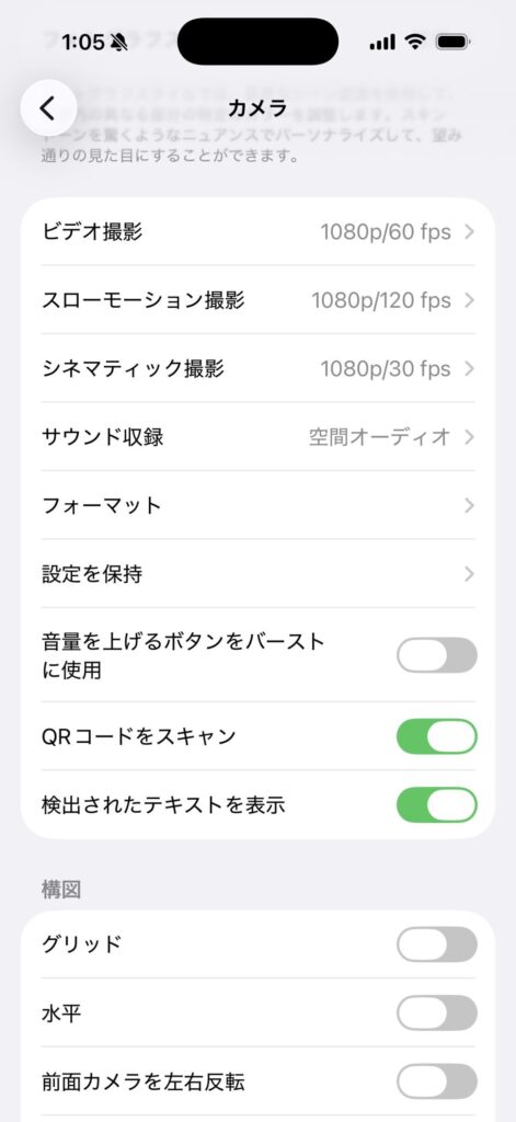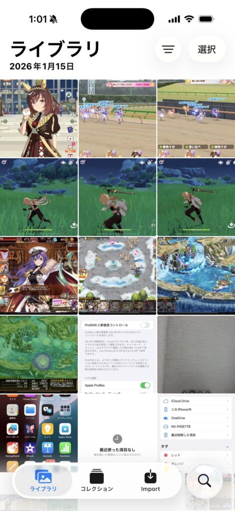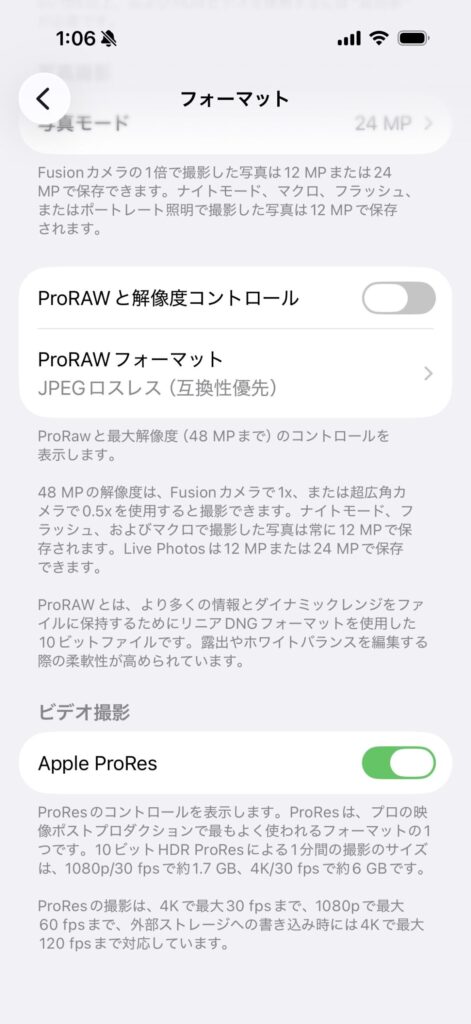 NX-P4MGをiPhone Proシリーズの13以降に接続していれば、ProRes撮影のファイルは自動的に保存される。ProRes撮影はカメラ設定で有効にしていないと使えない。まずは、ProRes撮影が有効になっているかを「カメラ」設定で確認する。